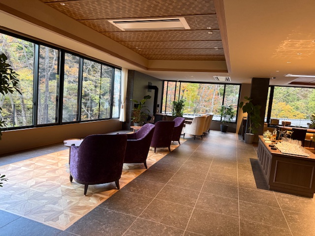 窓の外が一面、紅葉の「THE YUKAWA一條支店」のロビー